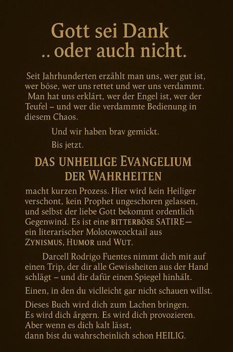 Es beginnt wie ein Scherz - und endet mit einer Ohrfeige für unser Wertesystem. In Das unheilige Evangelium der Wahrheiten stellt Autor Darcell Rodrigo Fuentes alles infrage, was wir für ,,heilig" halten: Religion, Moral, Politik, Gesellschaft und uns selbst.